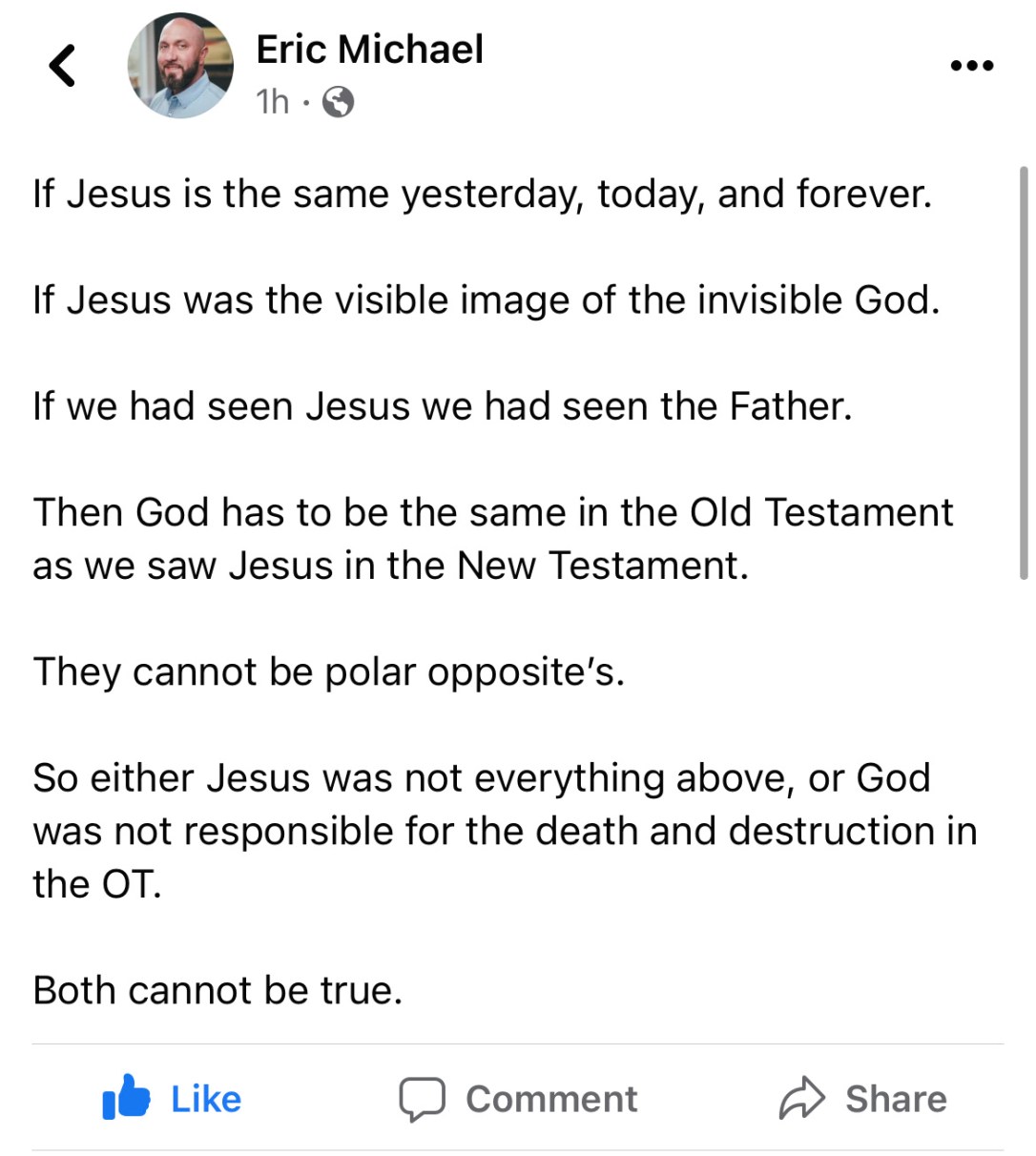 The Jesus of the New Testament was nothing like the God of the Old Testament. Yet, scripture tells us that Jesus was โGod ๐๐ถ๐๐ต us.โ Jesus was ๐๐ผ๐ฑ ๐๐ก the flesh. And he was never anything like the OT describes God. The NT is how I choose to view God, like Jesus, because Jesus ๐๐ฎ๐ God in the flesh.โฅ๏ธ
